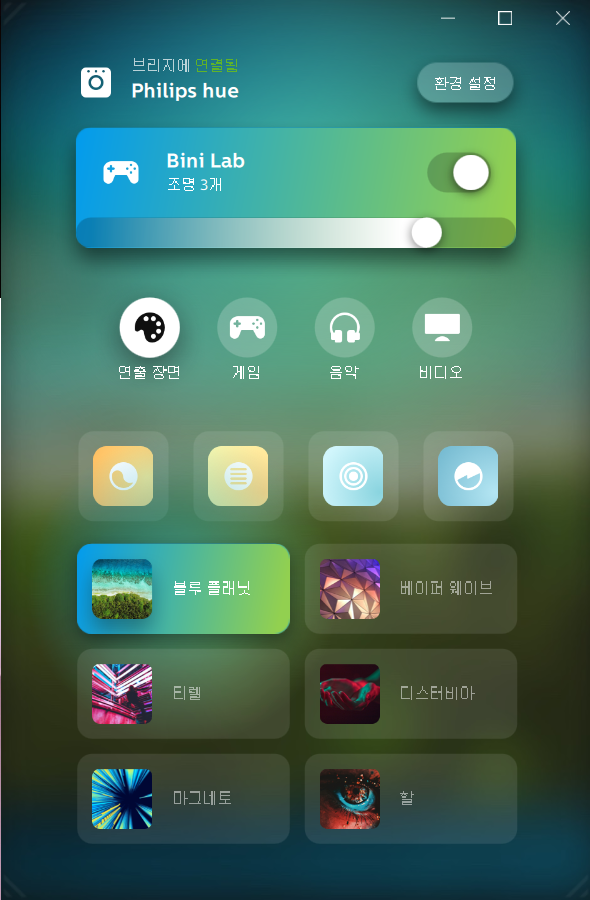필립스 휴 기본으로 제공하는 연출장면이 있습니다. (본인이 직접 만들 수도 있습니다.)